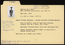 | Description: | Part of handle, much of back wall missing. General type as P 24316 (ΣΑ 2526): This is the characteristic general type for the large proportion of the lekythoi from this group. Bell mouth with variations in height and spread; lip usually reserved, occasionally glazed. Disk foot of varying thickness; below picture either one or two reserved lines. Added colors more or less well preserved. Only substantial variations are noted in the following descriptions. Shoulder: strokes above lotus bud (skipping two). Scene: Dionysos seated right; on each side, a Maenad moving away. Same hand as P 24428 (ΣΑ 2638). | |