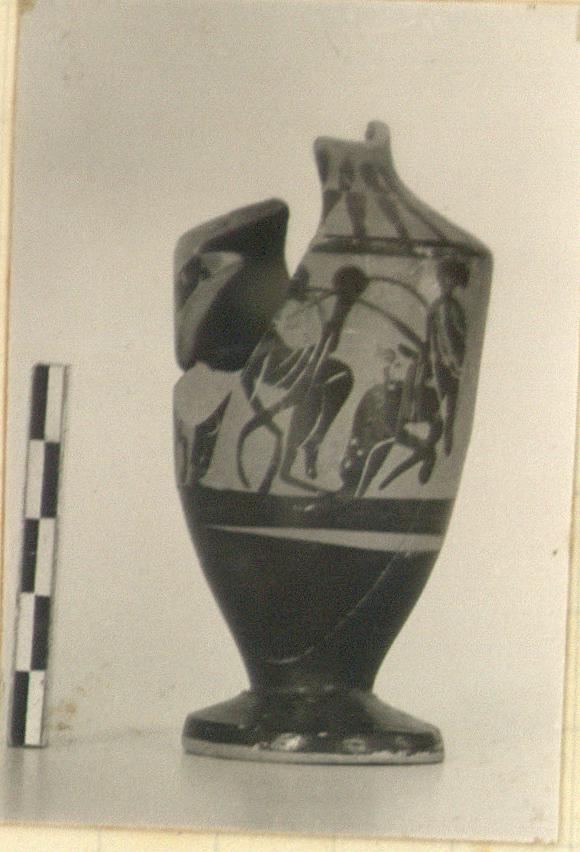 | Description: | Mouth, much of shoulder with handle and wall fragment missing. General type as P 24316 (ΣΑ 2526): This is the characteristic general type for the large proportion of the lekythoi from this group. Bell mouth with variations in height and spread; lip usually reserved, occasionally glazed. Disk foot of varying thickness; below picture either one or two reserved lines. Added colors more or less well preserved. Only substantial variations are noted in the following descriptions. Shoulder: strokes above rays. Scene: Dionysos seated right holding horn; on each side, Maenad looking in. | |