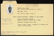 | Description: | Mouth and handle missing. General type as P 24316 (ΣΑ 2526): This is the characteristic general type for the large proportion of the lekythoi from this group. Bell mouth with variations in height and spread; lip usually reserved, occasionally glazed. Disk foot of varying thickness; below picture either one or two reserved lines. Added colors more or less well preserved. Only substantial variations are noted in the following descriptions. Shoulder: strokes above rays. Scene: draped figure, a Maenad(?) between two Satyrs, moving right. | |