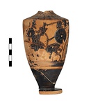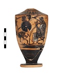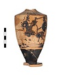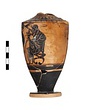 | Description: | Handle, mouth, neck, foot fragment missing. Shoulder: strokes above lotus bud (skipping one). Scene: Athena seated between two men holding kantharos (Dionysos and Hephaistos?). Same hand as P 24107 (ΣΑ 2407); also P 24477 - P 24483 (ΣΑ 2687 - ΣΑ 2693). | |