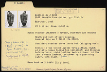 | Description: | Mouth and part of neck missing. General type as P 24316 (ΣΑ 2526): This is the characteristic general type for the large proportion of the lekythoi from this group. Bell mouth with variations in height and spread; lip usually reserved, occasionally glazed. Disk foot of varying thickness; below picture either one or two reserved lines. Added colors more or less well preserved. Only substantial variations are noted in the following descriptions. Shoulder: strokes above lotus bud (skipping one). Scene: in the middle Apollo with cithara right; at right, woman facing him (Ariadne?) and Dionysos holding horn, standing right looking back at them. At the left a woman (Maenad) followed by a gesturing Satyr, both right. Same hand as P 24476 (ΣΑ 2686). | |