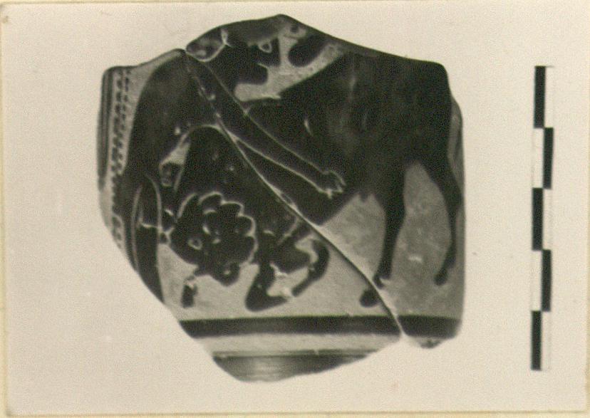 | Description: | Wall fragment. Scene: Theseus kneeling on one knee right binding the bull; garment hanging in field. Same hand as P 24486 (ΣΑ 2696). | |
