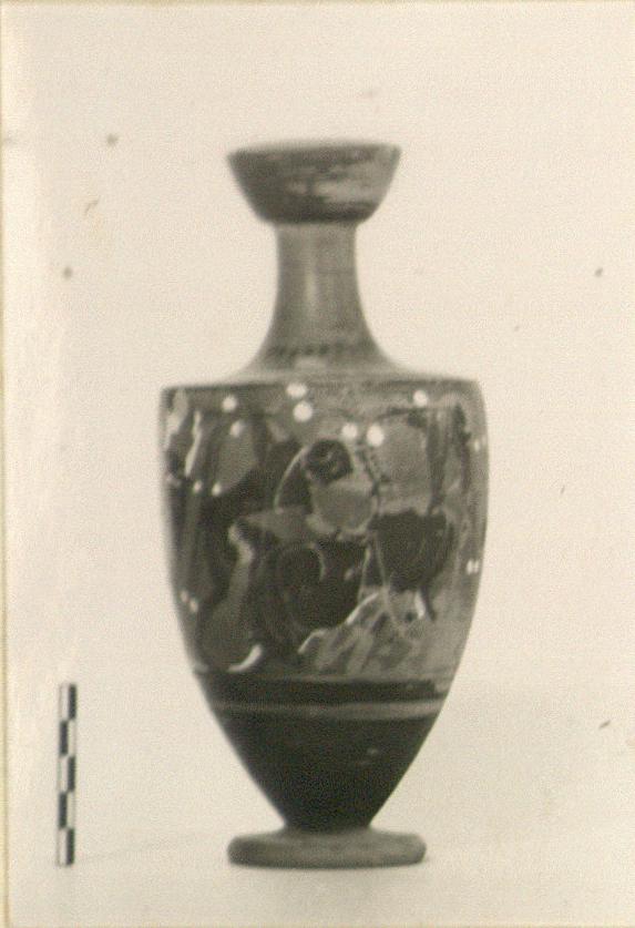 | Description: | Handle missing. General type as P 24316 (ΣΑ 2526): This is the characteristic general type for the large proportion of the lekythoi from this group. Bell mouth with variations in height and spread; lip usually reserved, occasionally glazed. Disk foot of varying thickness; below picture either one or two reserved lines. Added colors more or less well preserved. Only substantial variations are noted in the following descriptions. Top of mouth sloping outwards. Shoulder: strokes above dotted lotus bud (skipping two). Scene: youth stooping to right binding the bull; behind him, Athena; on the right youth with himation, walking away. | |