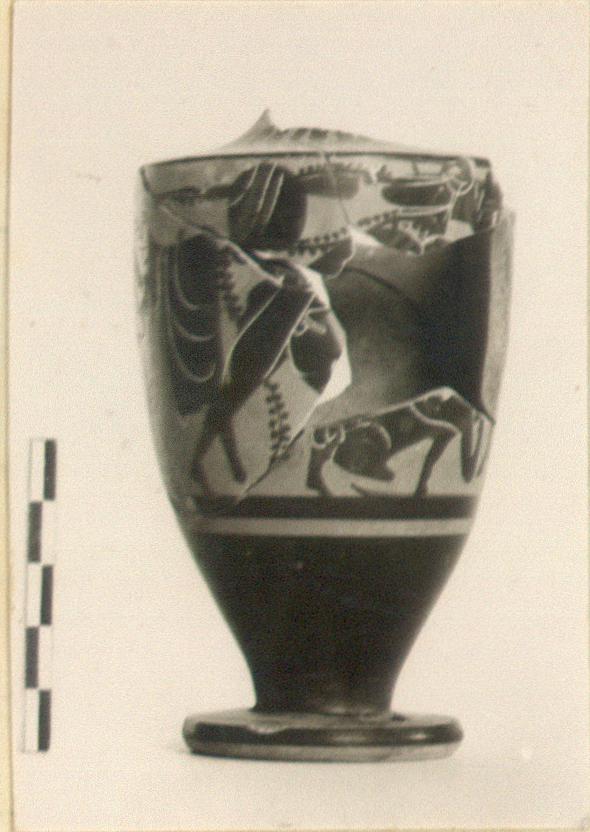 | Description: | Mouth, neck, handle, much of shoulder and walls missing. Shoulder: strokes above rays. Scene: Herakles (much missing) stooping to right binding the bull (middle part missing). On each side a youth coming up, holding the club; both to the right (Iolaos?). Garments, bow and arrow, hanging in field. | |