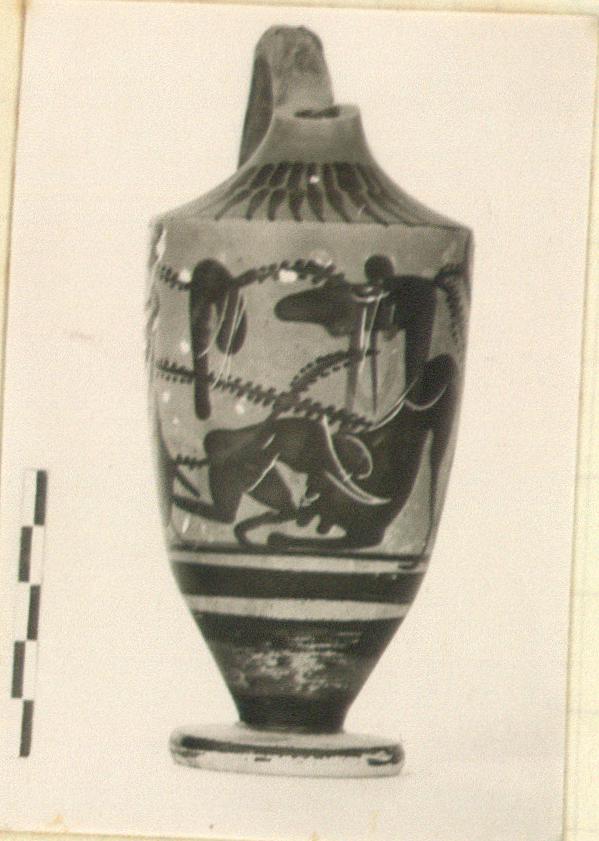 | Description: | Mouth and neck missing. General type as P 24316 (ΣΑ 2526): This is the characteristic general type for the large proportion of the lekythoi from this group. Bell mouth with variations in height and spread; lip usually reserved, occasionally glazed. Disk foot of varying thickness; below picture either one or two reserved lines. Added colors more or less well preserved. Only substantial variations are noted in the following descriptions. Shoulder: strokes above rays. Scene: Herakles right, striking the lion with the club; on each side, a woman running away; bow, arrow and garments hanging in field. Same hand as P 24499 (ΣΑ 2709). | |
