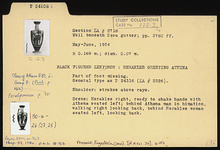 | Description: | Part of foot missing. General type as P 24316 (ΣΑ 2526): This is the characteristic general type for the large proportion of the lekythoi from this group. Bell mouth with variations in height and spread; lip usually reserved, occasionally glazed. Disk foot of varying thickness; below picture either one or two reserved lines. Added colors more or less well preserved. Only substantial variations are noted in the following descriptions. Shoulder: strokes above rays. Scene: Herakles right, ready to shake hands with Athena seated left; behind Athena, man in himation, walking right and looking back; behind Herakles, woman seated left, looking back. | |