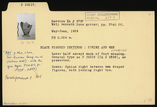 | Description: | Lower half except much of foot only preserved. General type, as far as preserved, as P 24316 (ΣΑ 2526): This is the characteristic general type for the large proportion of the lekythoi from this group. Bell mouth with variations in height and spread; lip usually reserved, occasionally glazed. Disk foot of varying thickness; below picture either one or two reserved lines. Added colors more or less well preserved. Only substantial variations are noted in the following descriptions. Scene: Sphinx right between two draped figures, both looking right too. | |