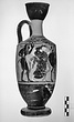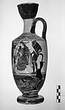 Shoulder: tongues and palmettes with dots (three and two); lotus buds next to handle. A pair of red lines below scene.