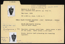 | Description: | Mouth and handle missing. "Little Lion" shape. Shoulder: strokes above rays. Above scene: a pair of red lines. Scene: warrior left attacking his kneeling opponent. Under scene: a red band. | |
