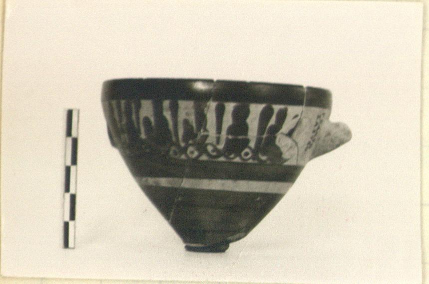 | Description: | Most of handles, foot, and parts of rim, missing. Small deep pointed shape, cf. P 16776 (RRCS). Reserved band at handle zone decorated with a roughly painted band of palmettes alternating with slender leaves, set on a chain of dotted o'es. Traces of added colors; red for the palmette hearts, white dots on the petals. Palmette skyphos. | |
