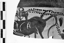 Description:   Rim and wall fragment, with one handle, from a large cup skyphos; part of one figured panel preserved.