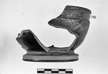 | Description: | Base ring and profile complete, but only a little of the wall, with the stump of one handle. Cup skyphos, the general effect similar to P 24584 (ΣΑ 2794), but the details different, and bowl deeper in proportion to its diameter. Vertical inset rim with heavy rolled lip. Base ring has a marked projection below the wall, a nearly vertical outer face, and a deep bevelled inner face (recalling the feet of the deep skyphoi of the Theseus painter and the like). Two scratched grooves at junction of foot and wall. Reserved: the outer face of the foot, the resting surface and the space inside, with two circles and dot. Cf. Agora XII, no. 576. ADDENDA Rim missing [LWK 1978]. | |