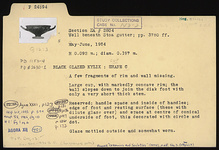 | Description: | A few fragments of rim and wall missing. Large cup, with markedly concave rim; the wall slopes down to join the disk foot with only a very short thick stem. Reserved: handle space and inside of handles; edge of foot and resting surface (these with dilute glaze over) and space at center of conical underside of foot, this decorated with circle and dot. Glaze mottled outside and somewhat worn. | |