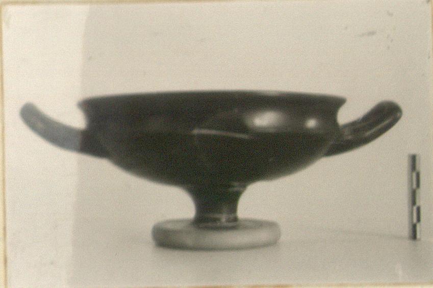 | Description: | Fragments of rim and floor missing. Concave rim; stem separated from disk foot by ring set off by scratched grooves. Reserved: handle spaces and insides of handles; edge of foot and resting surface; upper sides and top of cone beneath foot. This is the characteristic cup shape for this well; cf., with minor variations, those following; also P 24120 and the figured example, P 24102. | |