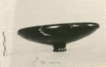 | Description: | Foot broken off; chips and a little of floor missing. Shallow bowl; heavily rolled rim undercut on the outside. Two scraped lines set off ring above foot. Small circle and dot at reserved top of foot cone. Good blue-black glaze. Cf. Agora XII, no. 958. | |