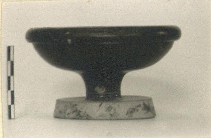 | Description: | Complete except for chips. Heavy rolled rim projecting, set off below by a scratched line; a second line around the lower wall, and a pair setting off a light ridge just above foot. Broad, thick disk foot, the outer face nearly vertical; inside the resting surface the bottom is recessed: more a skyphos than a cup foot. Reserved: edge of foot and resting surface, and space inside foot, this decorated with a broad and a narrow glazed band near the outer edge and a circle and dot at the center. | |