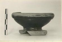 | Description: | Large piece of rim and of foot missing. Squat dish on heavy cup foot; almost no stem; rolled rim, slightly undercut outside; no scraped line. Reserved: edge of foot and resting surface; center of cone. | |