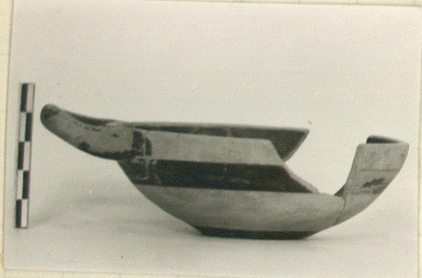 | Description: | Several fragments preserve center of floor with foot and part of floor and rim, with handle. Large and shallow, with a low bevelled foot ring and a cup handle rising above the rim. The inside glazed, but the rim reserved, and a disk at the center of the floor with central circle and dot. Broad glaze band around wall outside, and the sloping outer face of the foot glazed, but not the resting surface. Within the foot, a broad and a narrower glazed circle around a central dot. | |