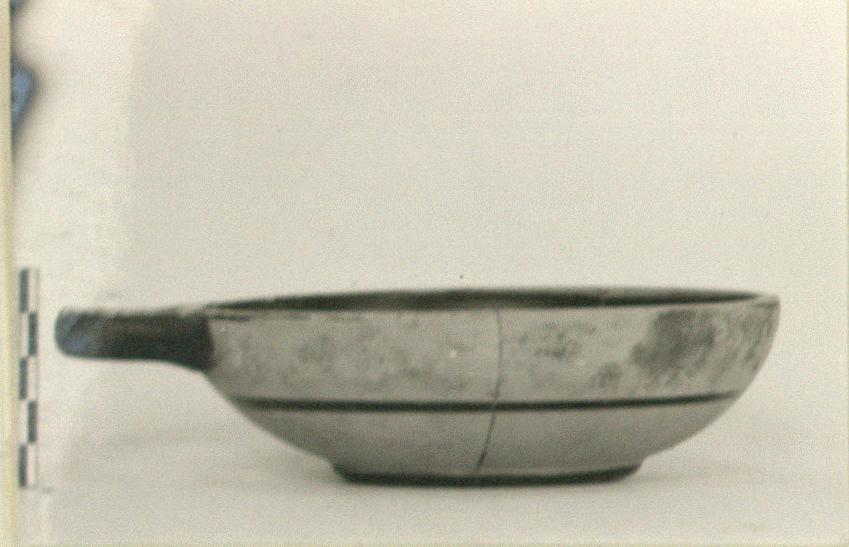 | Description: | Complete except for chips. Bevelled foot, the underside slightly concave (not a ring). Loop handle. The inside glazed, with reserved central disk decorated with circle and dot; the rim reserved, but with a line of glaze around its outer edge. Band of glaze around wall, and around face of foot. (Another which could be from the same batch but has a slightly higher foot, in tray.) | |