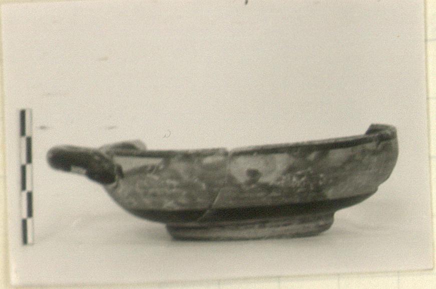 | Description: | Fragments of wall and rim missing. Ring foot roughly pared; wall drawn in to a narrow rim rounded on top; very stubby U-handle. Glaze inside good; on the outside, the dilute wash is very carelessly applied. Inside and rim glazed; reserved disk at center, with circle and dot. Outside, a glazed band on the wall, and on inner face of foot only; circle and dot within foot. Cf. Agora XII, no. 735. | |
