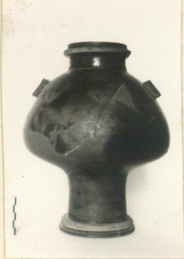 | Description: | Fragments missing from wall; lip chipped. Restored in plaster. Ring foot with double torus profile; rim flanged for lid; double string-lugs on shoulder. Glazed outside and to base of neck inside; the outer face of the horizontal flange reserved, the upper moulding of the foot, and the underside, considerably mottled with red. Inside, glaze fairly heavy but streaky, overall except where it happened not to reach; directly below neck, and in an irregular band lower down. | |
