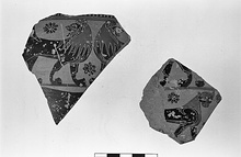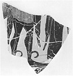 Description:   Fragment a) made from three fragments: lower part of woman, in chiton and himation, left; facing her, seen in three-quarters view, Hermes, lower part preserved. Behind Hermes, at the upper left corner of the fragment part of chests of horses. Below the scene, part of palmette band.