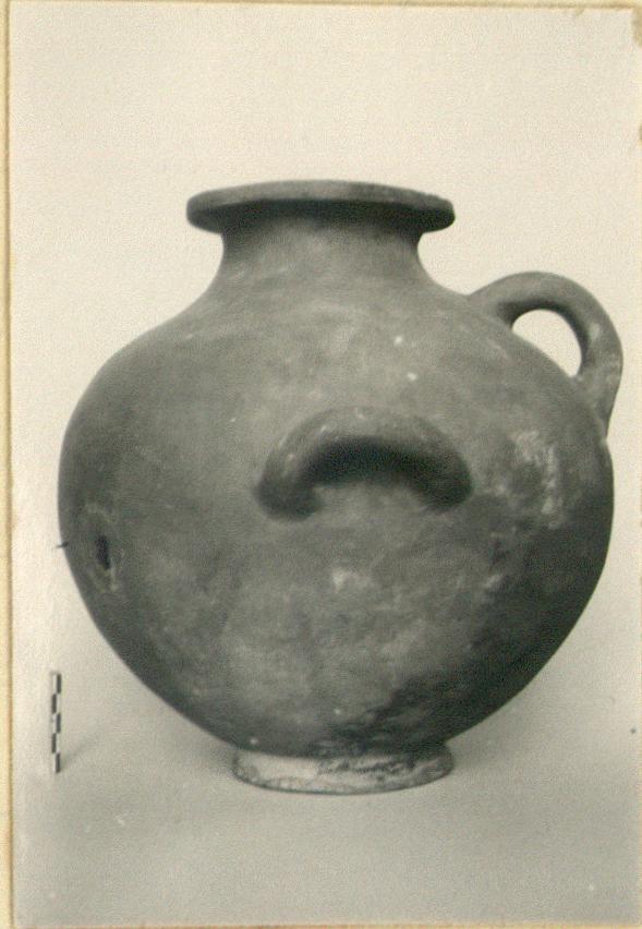 | Description: | Intact, except six small holes on walls and chips, especially from foot. Ring foot flaring a little; globular body; flat projecting rim with somewhat raised outer edge; handles round in section with a thumb depression at lower attachment of the vertical one. Micaceous buff clay with grits. Cf. Agora XII, no. 1595. | |