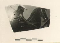 | Description: | Head and part of one horse, right, and tail of another in front of first. Man behind horse leading it; in his left hand a pair of spears. White for beard and garment, mane and tail. Buff-red clay with impurities. | |