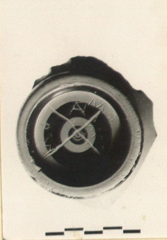 | Description: | Ring foot, and a little lower wall of a semi-glazed one-handler. Poor black glaze on floor. Glaze band around outer edge of foot and glazed circles on underside. Several groups of letters scratched on bottom: <graphic> Sherds from this fill in tin 333. | |