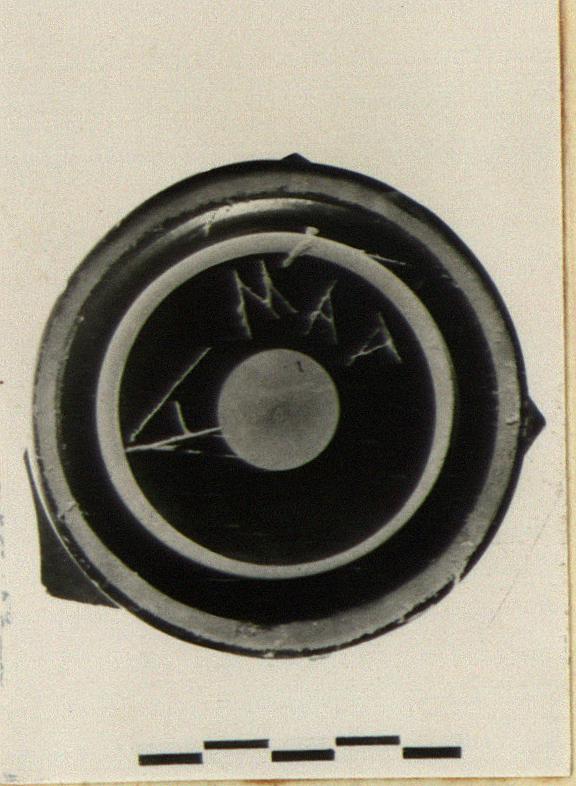 | Description: | Bottom with molded ring foot preserved. Four letters scratched through glaze on bottom: <graphic> Metallic black glaze inside and out save for reserved bands on resting surface and around edge of bottom and reserved circle in center. Sherds from this fill in Tin 159. | |