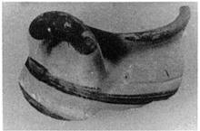 | Description: | Rim and one handle of small round-bodied pot, with two vertical loop handles set on shoulder just below vertical rim. Thin grayish-buff fabric. Bands of matte dark brown glaze on side, lip and top of handle. Traces o fwhite between the panels below the handle, and on the shoulder. Incrustation? Late Helladic III. | |