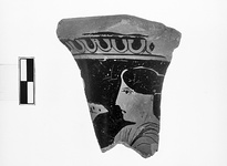 | Description: | Neck fragment with small part of mouth. Egg-pattern above the representation. Head and shoulders of a woman, to left, carrying a kalathos high in front of her. No relief contour. Neck only glazed inside. Cinnamon clay fired gray in places. Good glaze. | |