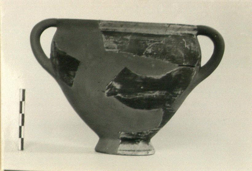 | Description: | Fragmentary. Offset rim with reserved band inside and out. Trace of handle and rim to shoulder. Restored in plaster. | |