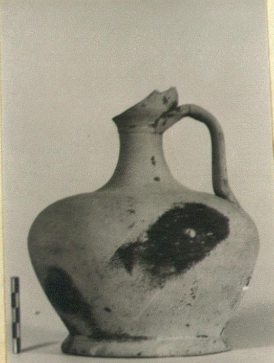 | Description: | [Originally identified as oinochoe.] Mended from two pieces. Most of mouth, small holes on body, chips from foot missing. Body dented. Flaring ring foot with flat resting surface; squat body; bell-shaped mouth; strap handle. Two grooves at base of mouth. Covered all over with black glae of which very little is preserved. Inside of mouth and neck glazed. Buff clay. Dull flaky glaze. The glaze in the dent has fired red. | |