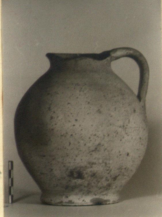 | Description: | Mouth and foot chipped. Ring foot with flat resting surface; barrel-shaped body; round mouth; flattish handle attached at one end on rim. Red gritty clay. Whitish slip. Badly made and dented. | |