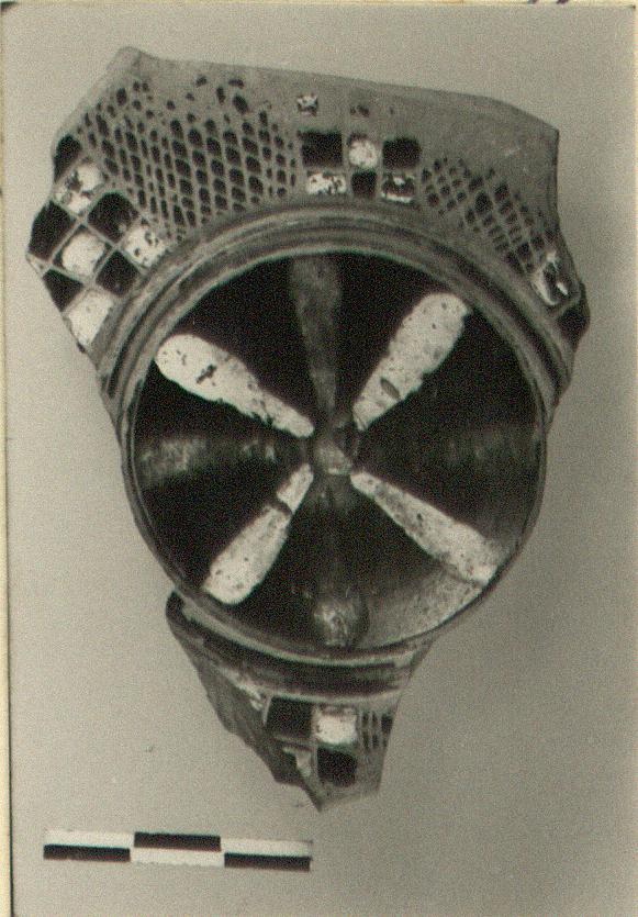 | Description: | Fragment preserving center of floor with ring foot and beginning of walls. Two scraped circles around medallion. In medallion, rosette with petals alternately white and diluted clay. Beginning of wall decoration preserved: appears to consist of bands radiating from the medallion, alternately filled with checkerboard and hatching. Glaze fired very dark brown. | |