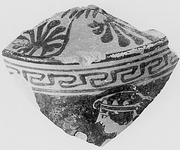 | Description: | Shoulder piece. Blobs at base of neck; black figured palmettes on shoulder. Key to right above scene. Head and tiny part of right shoulder of woman left, wearing fillet with upright leaves in front. Relief contour for face and neck. Burned. | |