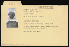 | Description: | Neck and handle missing. Ring foot. At base, broad bands with narrow banding above. Coursing hounds on shoulder. Red glaze, much worn. | |