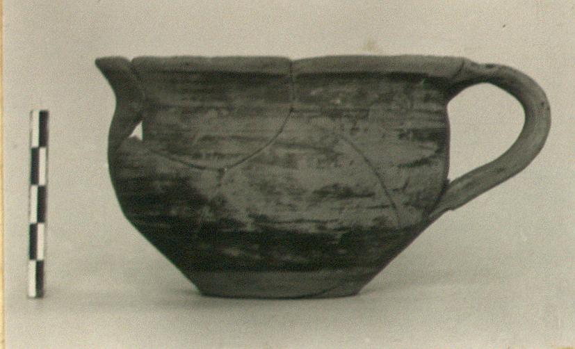 | Description: | High flaring rim, band handle, flat base. Glazed solid except for zone above foot. Dots on rim, vertical lines on handle. Worn, dull black glaze. Late Geometric. | |