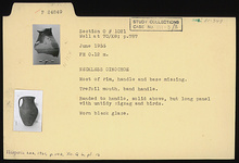 | Description: | Neckless oinochoe. Most of rim, handle and base missing. Trefoil mouth, band handle. Banded to handle, solid above, but long panel with untidy zigzag and birds. Worn black glaze. | |