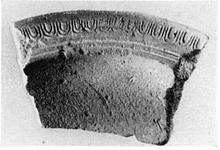 | Description: | Rim fragment. Shallow basin with heavy moulded rim. A band of ovolos impressed on top of rim. Slightly pinkish-buff clay, light yellow on surface. | |