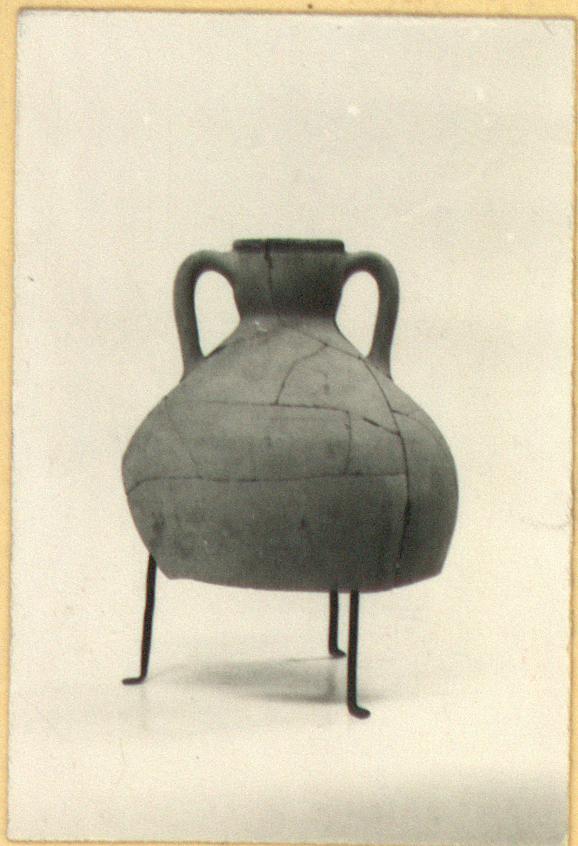 | Description: | Much mended, profile complete. Paint decoration as on the last, P 24873 (ΣΑ 2952), but shoulder band double. Parts of at least four more jars of this type in tray. ADDENDA We have top and bottom parts, but not middle. Lost in moving? [22 Oct. 1957]. | |
