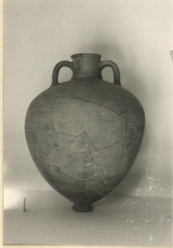 | Description: | One handle, half of neck, adjacent shoulder and body pieces missing. Restored in plaster. Flaring ring foot; big, broad-shouldered jar; flaring rim set off by groove; top of rim slopes down outward. Finger impression on base of handle. On opposite sides, graffiti: <graphic> Not smeared inside. | |