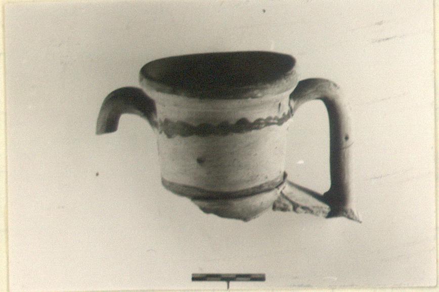 | Description: | Neck, one whole handle and half of the other preserved. Double handles; torus rim; neck tapers to a fold at base. Light slip decorated with matte brownish-black paint; bands on rim and base of neck; wavy line at level of upper handle attachment. Pinkish to gray clay; little or no mica; a few large pebbles. Cf. P 15911; cf. Hesperia 7 (1938), p. 607, fig. 29:210. | |