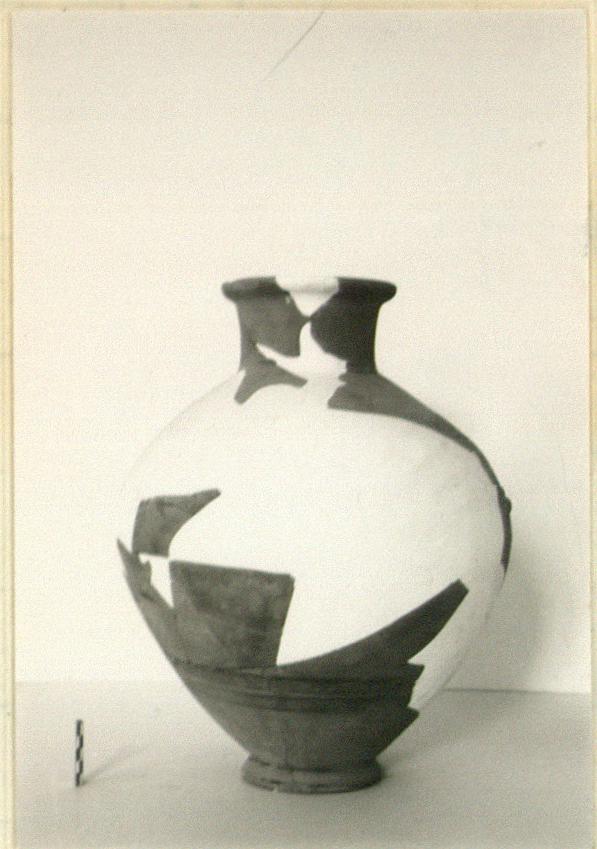 | Description: | Shoulder and walls fragmentary; handles not preserved; profile complete. Restored in plaster. The stumps of one side-handle remain but no evidence for vertical handle; may be a side-handled amphora. Substantial flaring ring foot; flat-topped rim. Two pairs of broad glazed bands on body, one on shoulder and one on lower wall; between these, large curving brush strokes of glaze and small irregular pendents. Remains of glaze bands on rim, at base of neck and on foot. Pinkish-buff clay. Glaze much worn. Rather coarsely made with a perceptible join between upper and lower walls. | |