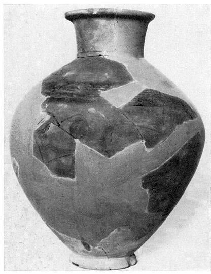 | Description: | Shoulder and walls fragmentary; handles not preserved; profile complete. Restored in plaster. The stumps of one side-handle remain but no evidence for vertical handle; may be a side-handled amphora. Substantial flaring ring foot; flat-topped rim. Two pairs of broad glazed bands on body, one on shoulder and one on lower wall; between these, large curving brush strokes of glaze and small irregular pendents. Remains of glaze bands on rim, at base of neck and on foot. Pinkish-buff clay. Glaze much worn. Rather coarsely made with a perceptible join between upper and lower walls. | |