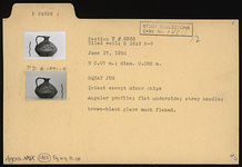 | Description: | [Originally identified as squat jug.] Intact except minor chips. Angular profile; flat underside; strap handle. Brown-black glaze much flaked. | |