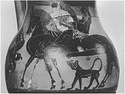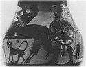 Picture in panel on front. A youth riding a black horse and leading a white one whose head and legs only are visible; behind walks a warrior with helmet, round shield and greaves. In front of the horses a bird in flight; under their bellies a small panther. Behind the warrior a lotus bud. Added red and white. Red on lip. Pair of red lines around body below picture.