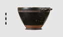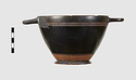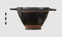 | Description: | One handle and fragments of body missing. Pair of red lines below handles and one above foot band. Rays in dilute glaze in band above foot. Bottom reserved with central dot and circle, and line around outer edge. Cf. Agora XII, no. 305. | |