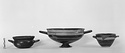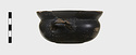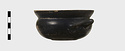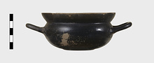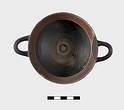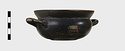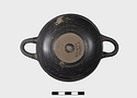 Description:   Part of one handle and fragment of lip missing. Offset lip. Two horizontal handles. Small flat bottom. Inside of lip reserved and decorated with added red. Bottom reserved with small black circle.